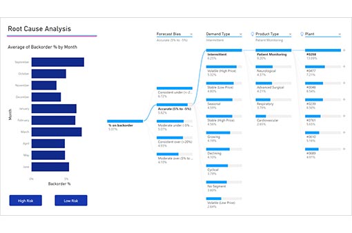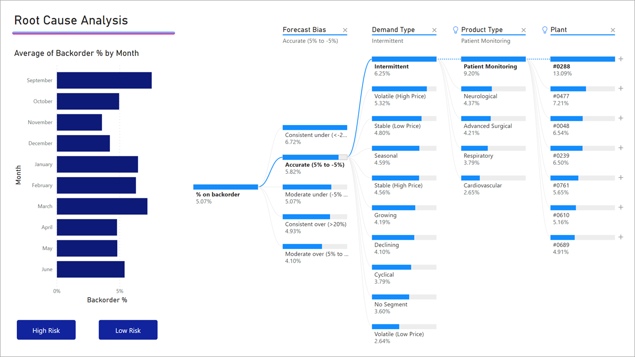 Naast een handmatige analyse kan de decomposition tree ook slimme analyses doen. Zo kan het bijvoorbeeld de top 10% van de posten laten zien die positief of een negatief bijdragen. Handig als men zoekt naar details en alleen de uitschieters wil zien.
